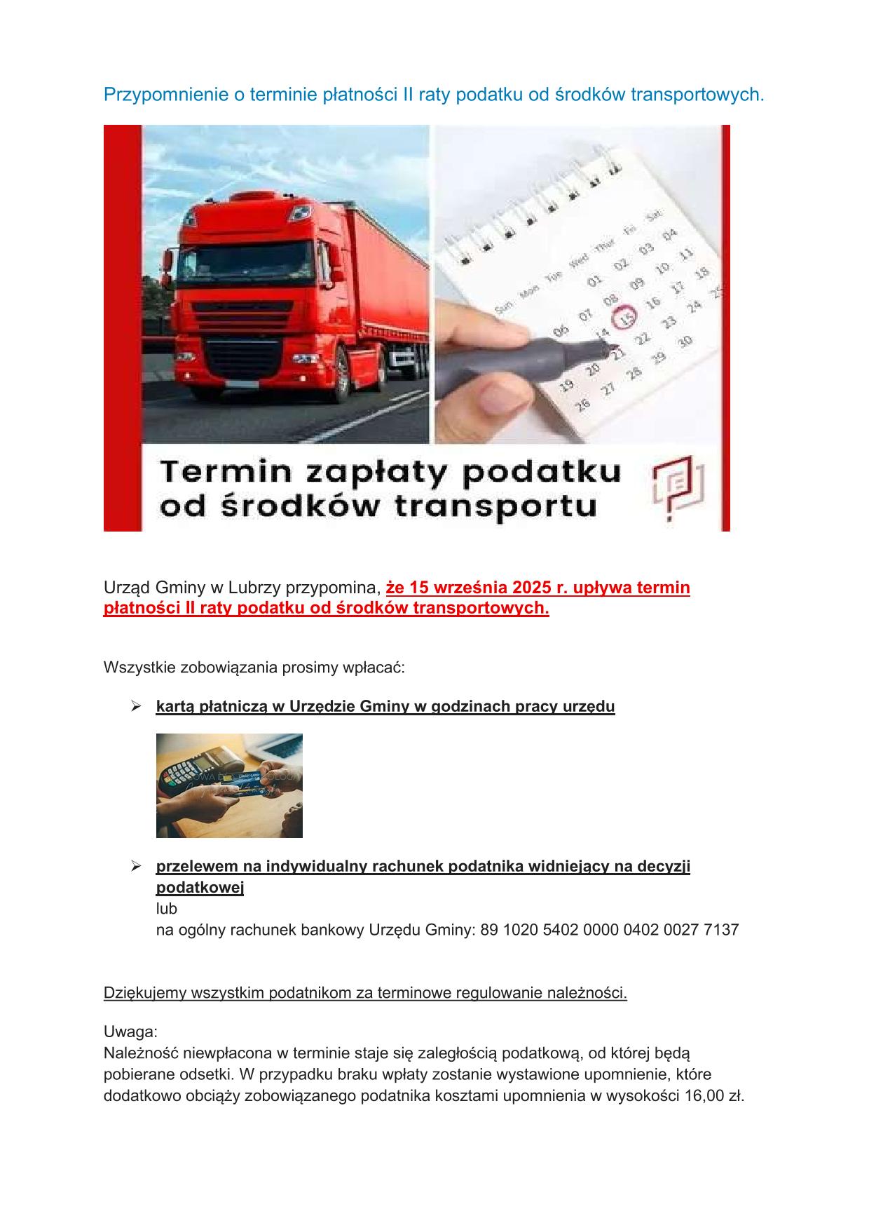 Przypomnienie o terminie płatności II raty podatku od środków transportowych. Archiwum 03.09.2025, Adrian Dwojak, 150