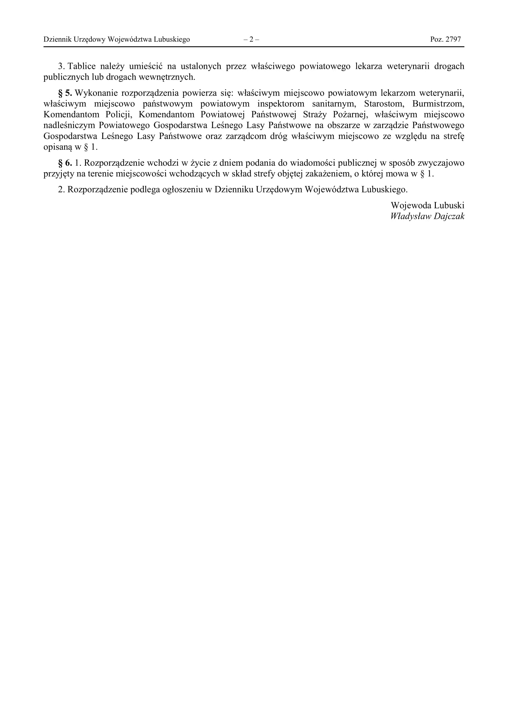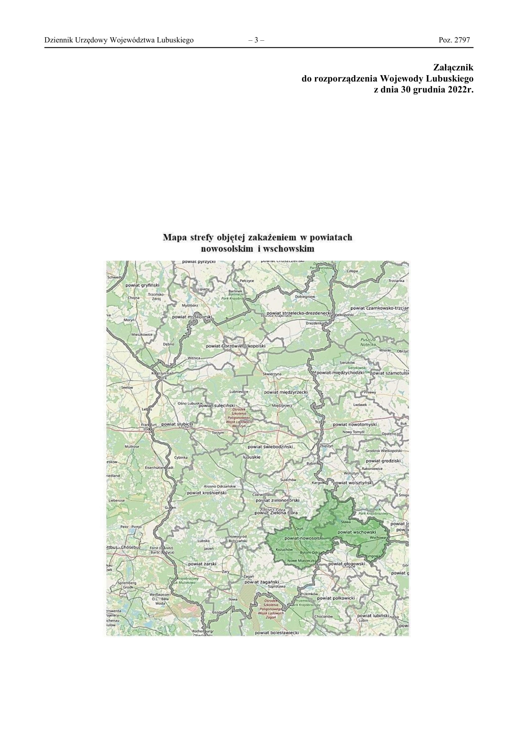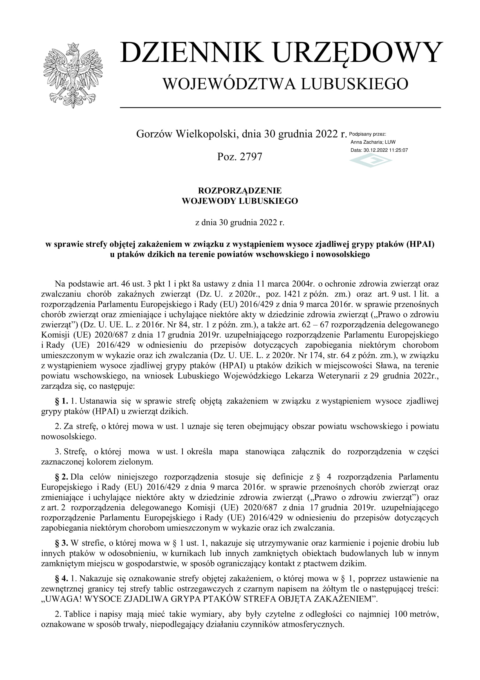 Rozporządzenie Wojewody Lubuskiego z dn.30.12.2022r w sprawie strefy objętej zakażeniem w związku z wystąpieniem wysoce zjadliwej grypy ptaków ( HPAI) u ptaków dzikich na terenie powiatów wschowskieg